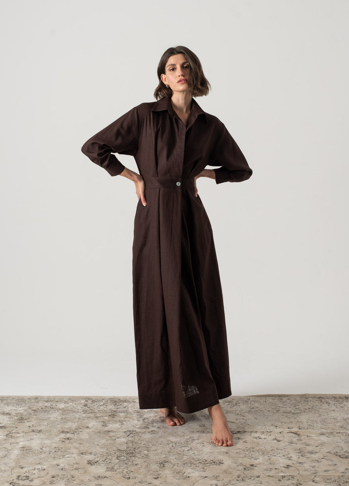 This luxury linen dress is a perfect blend of elegance and comfort. Crafted from high-quality, heavier linen, it offers a surprising level of warmth, making it versatile for cooler days. The tailored fit and soft lining provide both style and comfort, while the natural texture of the linen adds a sophisticated touch. Ideal for layering with boots or tights, this dress effortlessly transitions between seasons, offering a chic, timeless look that's both practical and luxurious.