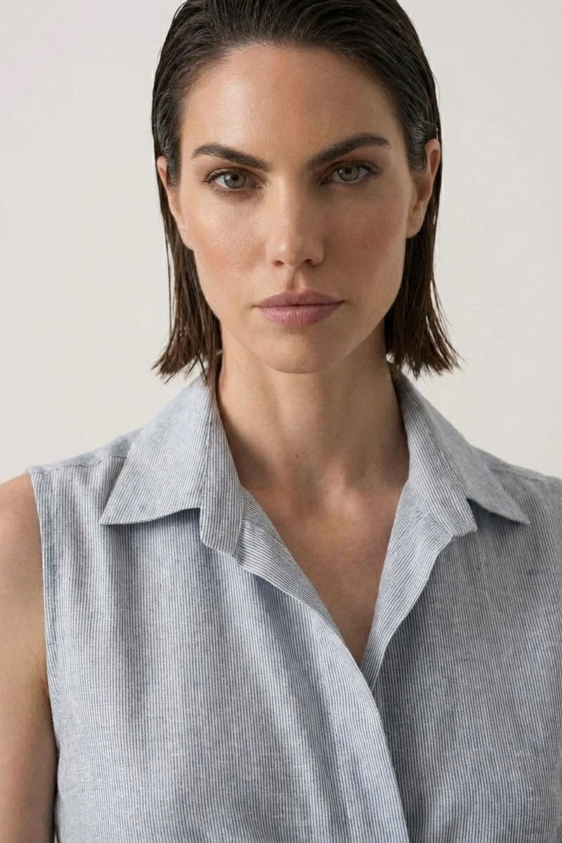 Introducing the Dante Sleeveless Linen Dress, a fresh take on the work-to-occasion classic. Cut from the same beloved base of our Halvar dress - an all-time favourite and best-seller; the Dante shares the flattering fit and timeless elegance that Halvar fans know and love. Its sleek sleeveless silhouette and subtle design detail elevate casual sophistication, while the sophisticated collar hides a contrast navy underlay that pops up to reveal a chic hint of colour, adding a playful, modern twist.